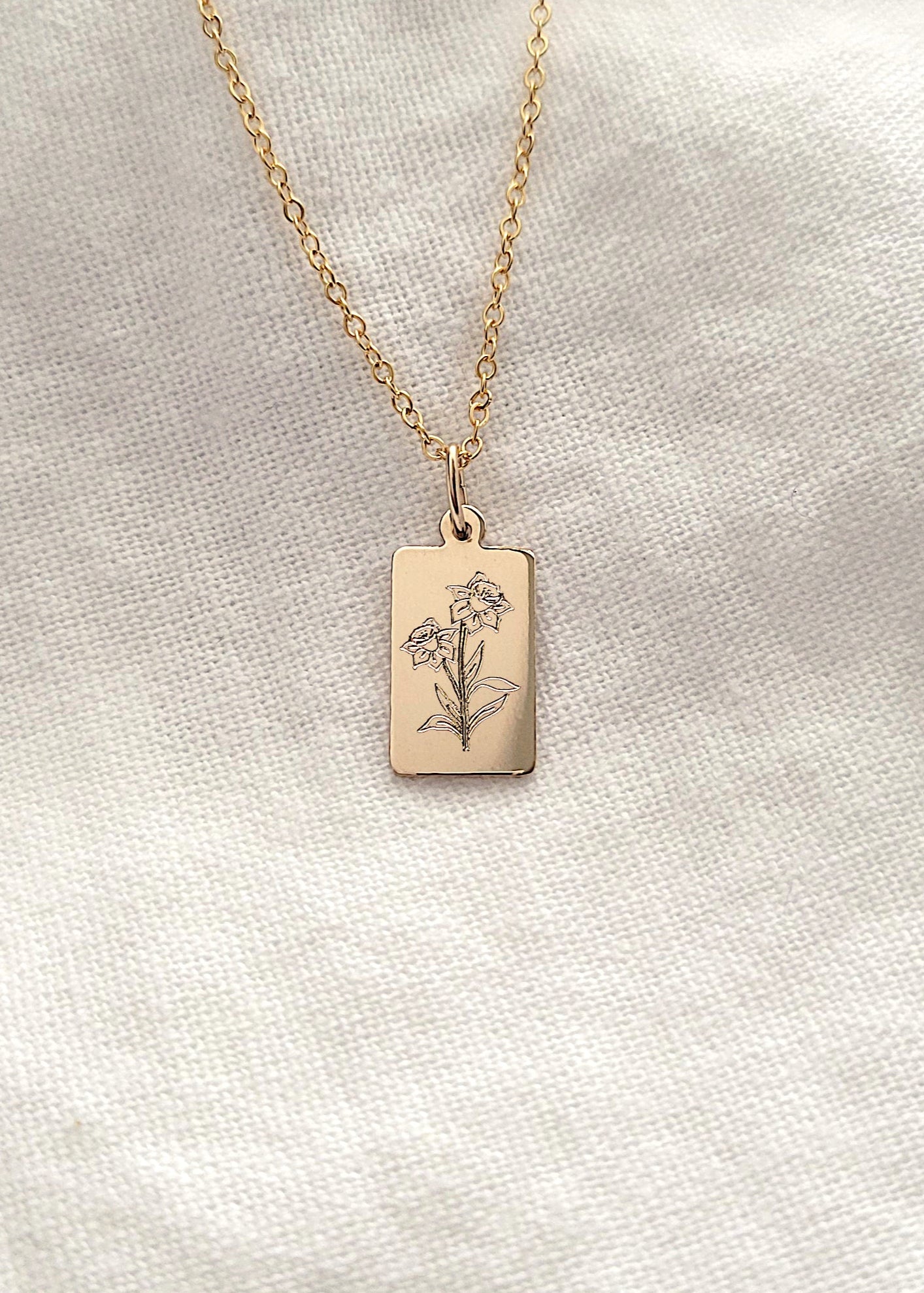 Custom engraved floral designs for every birth month on a classic, modern rectangle tag.